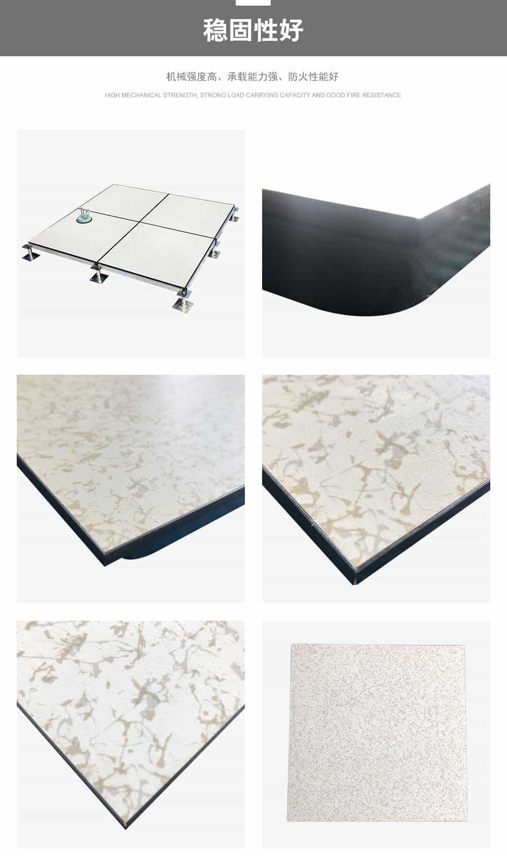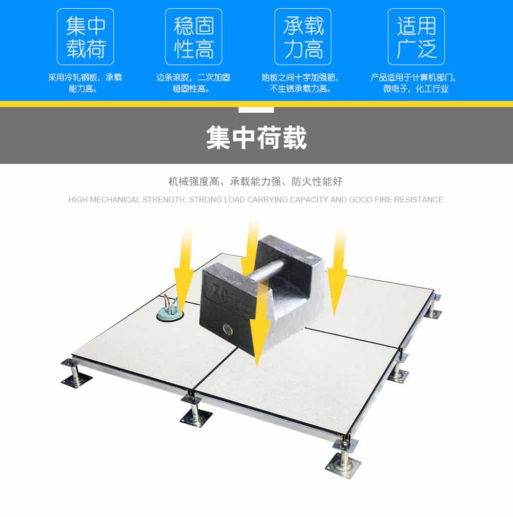 全鋼防靜電地板為全鋼組件,分有邊、無邊、微邊(三種邊處理方式)。底面采用SPCC深沖冷軋板拉伸成型鋼板厚度(0.4~1.5mm),球窩狀結(jié)構(gòu),增加地板的機(jī)械荷載強(qiáng)度。面板采用硬質(zhì)SPCC鋼板(0.5~2.0mm),上下經(jīng)過點焊焊接成型,切邊沖孔后,經(jīng)防銹處理,環(huán)氧樹脂粉末靜電噴涂后,中間填充發(fā)泡水泥(可以根據(jù)客戶需求發(fā)泡不同重量),再經(jīng)過日曬養(yǎng)護(hù)后形成穩(wěn)定的承載結(jié)構(gòu)。地板上表層粘貼防火板(HPL)/復(fù)合PVC/ 通體PVC/陶瓷地磚等不同材質(zhì)的裝飾表層,達(dá)到產(chǎn)品花色的多樣性、可以根據(jù)客戶需求個性化定制產(chǎn)品。搭配聯(lián)網(wǎng)支架、支架、螺釘組裝后,定位聯(lián)接更加準(zhǔn)確、精度可靠。